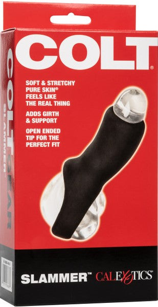 The adult toy innovators at CalExotics and the male-erotic pleasure experts at Colt have partnered to bring you a line of male sex toys dedicated to masculine pleasure seekers. Whether you’re a bashful beginner or an erotic expert, the Colt Slammer penis extender is your ticket to upgrading your pleasure tool. This penis extender sleeve enhances arousal, increases stamina and gives you jaw-Dropping girth enlargement with the life-like PureSkin sleeve. Step up your pleasure and never settle for less when it comes to size, our super stretchy Slammer penis girth extender with supportive scrotum strap will have you and your lover craving more, more, more. Give your partner a knee-shaking experience of a lifetime with increased girth, exposed tip and sensational stamina increase.
